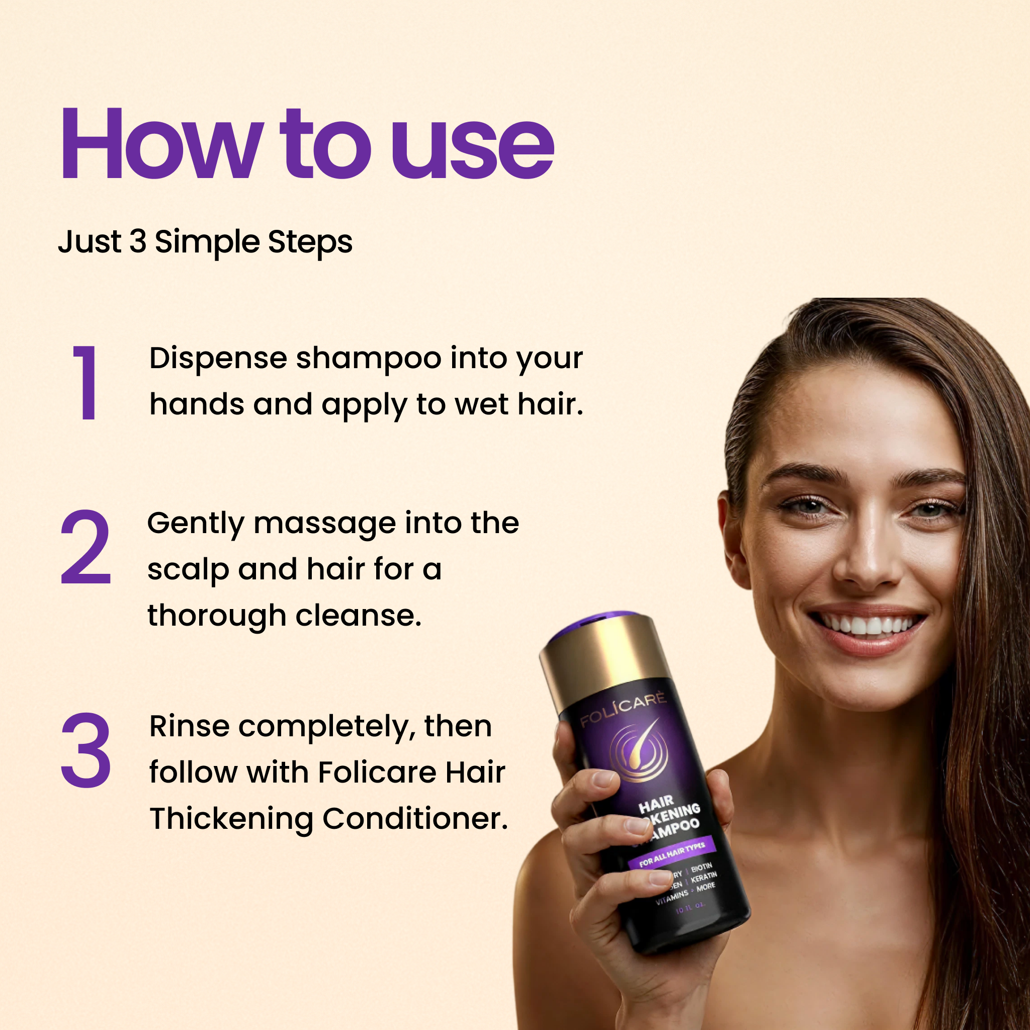 Rinse completely, then follow with Folicare Hair Thickening Conditioner.